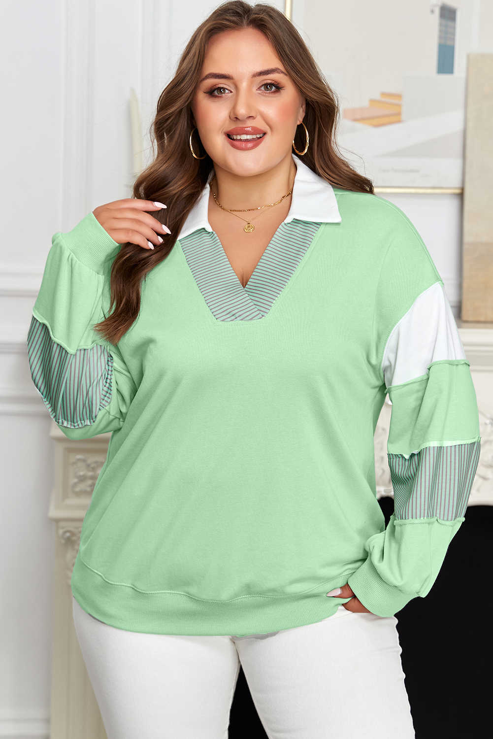 Moonlight Jade Color Block Striped Patchwork Collar V Neck Plus Size Sweatshirt