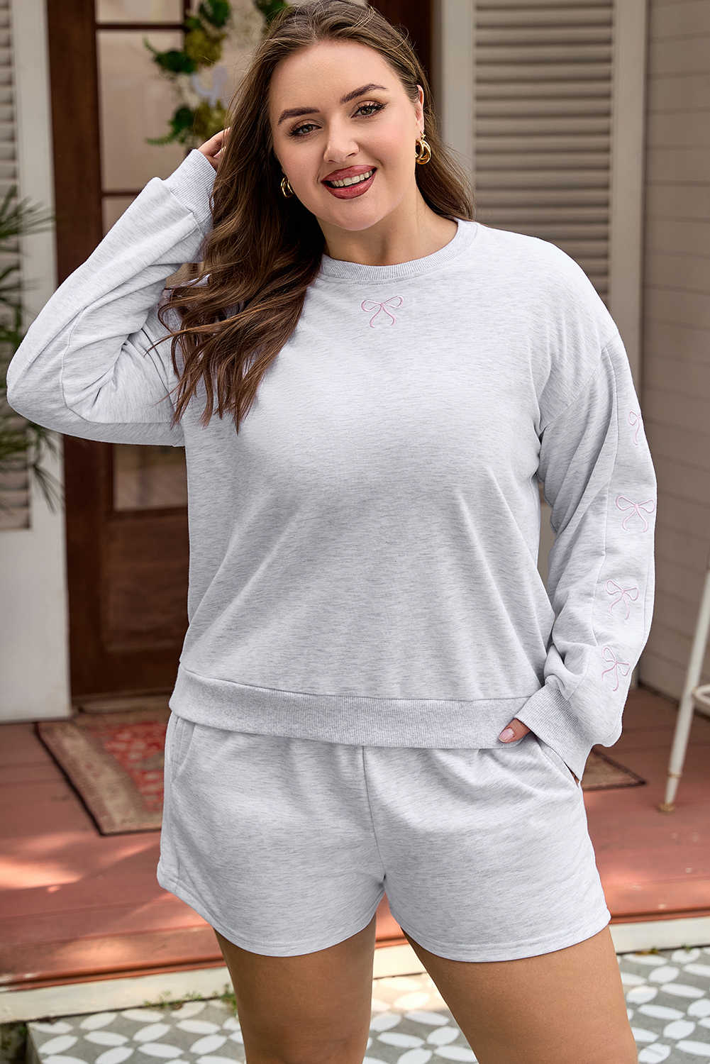 Light Grey Girly Bow Embroidered Puff Sleeve Pullover Loose Shorts Plus 2pcs Outfit