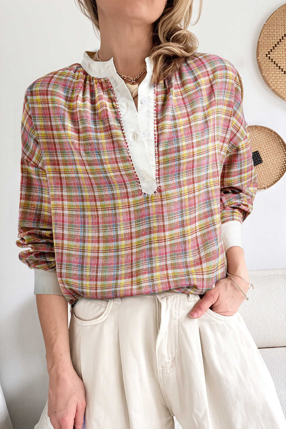 Myosotis Plaid Print Smocked High Waist Womens Loose Pants