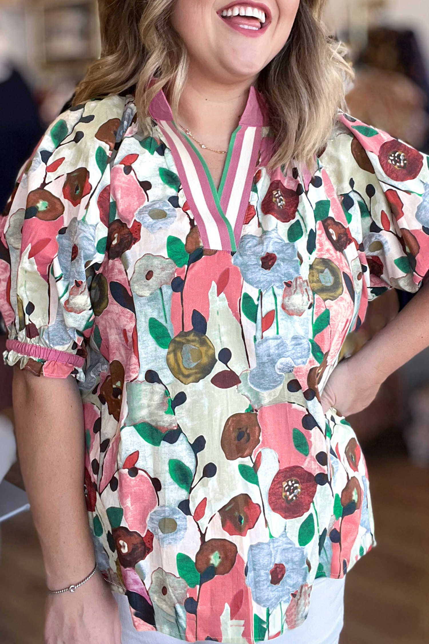 Pink V Neck Short Puff Sleeve Plus Size Floral Blouse