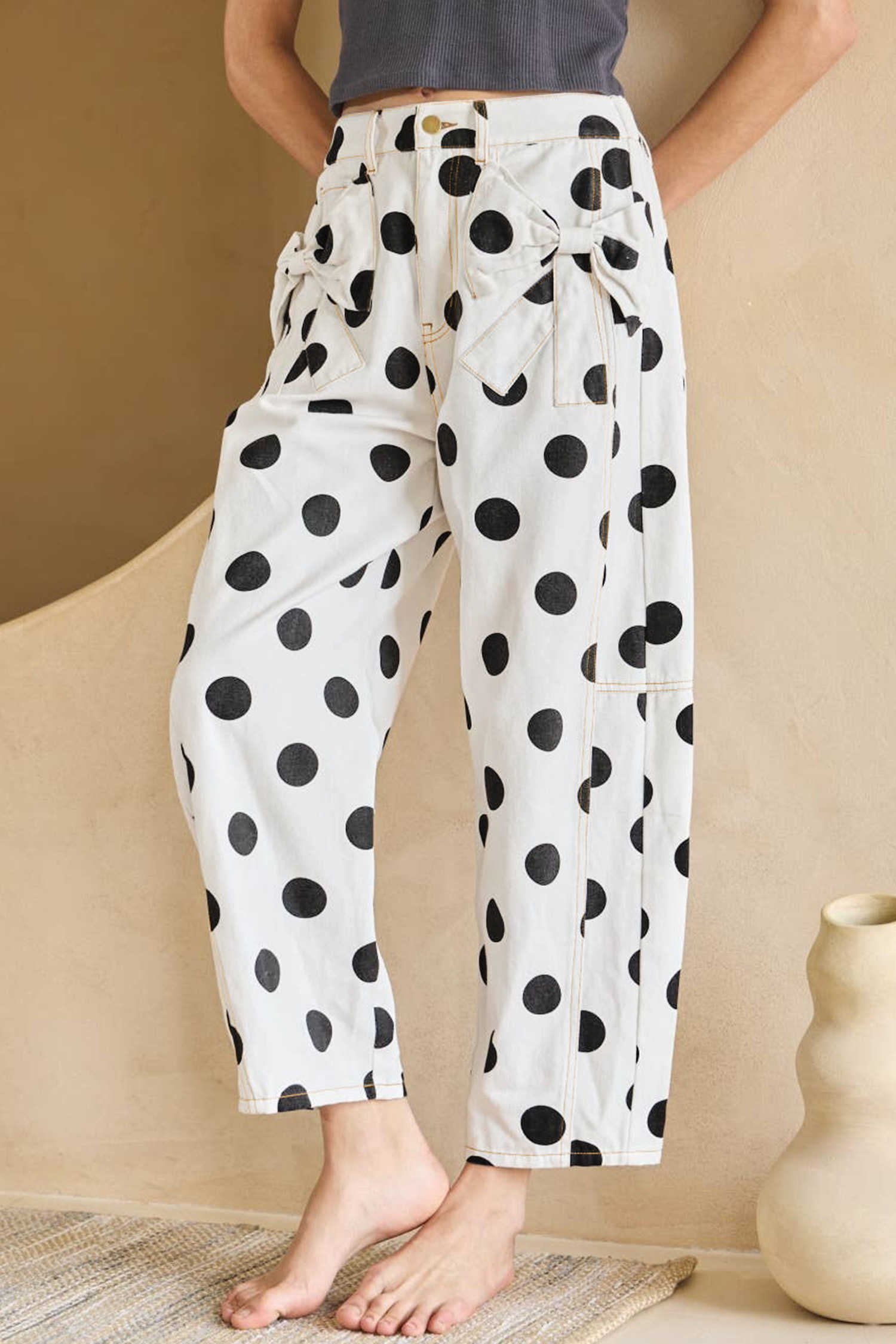 White Polka Dot Print Bow Detail Pocketed Jeans